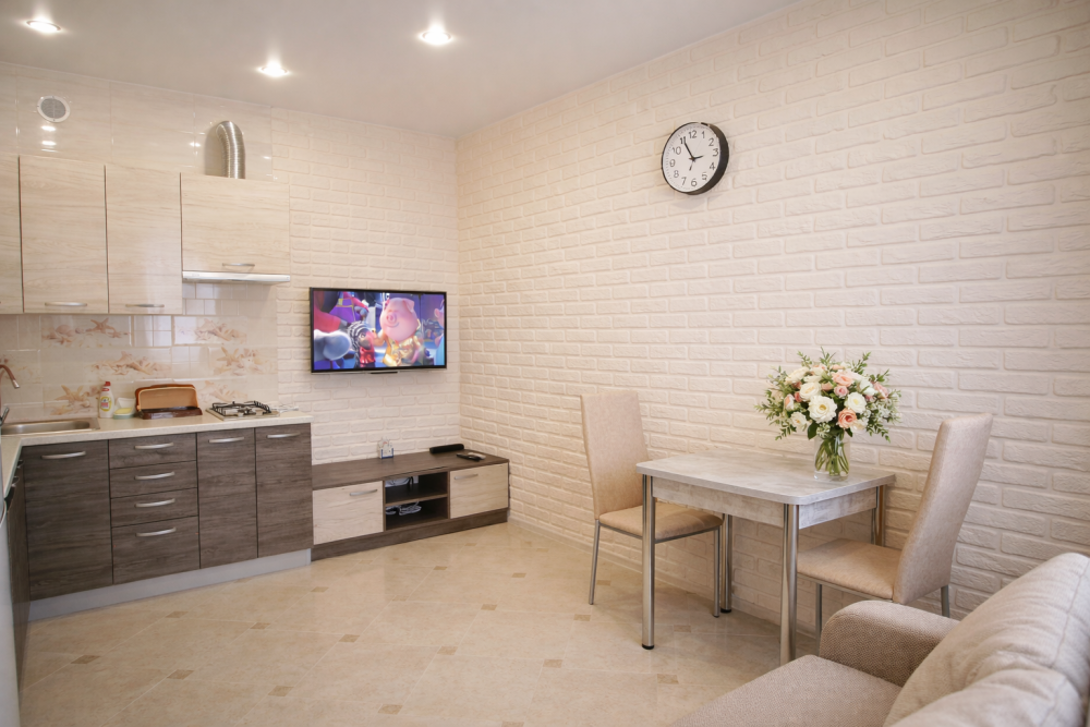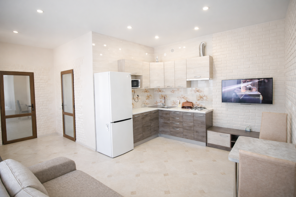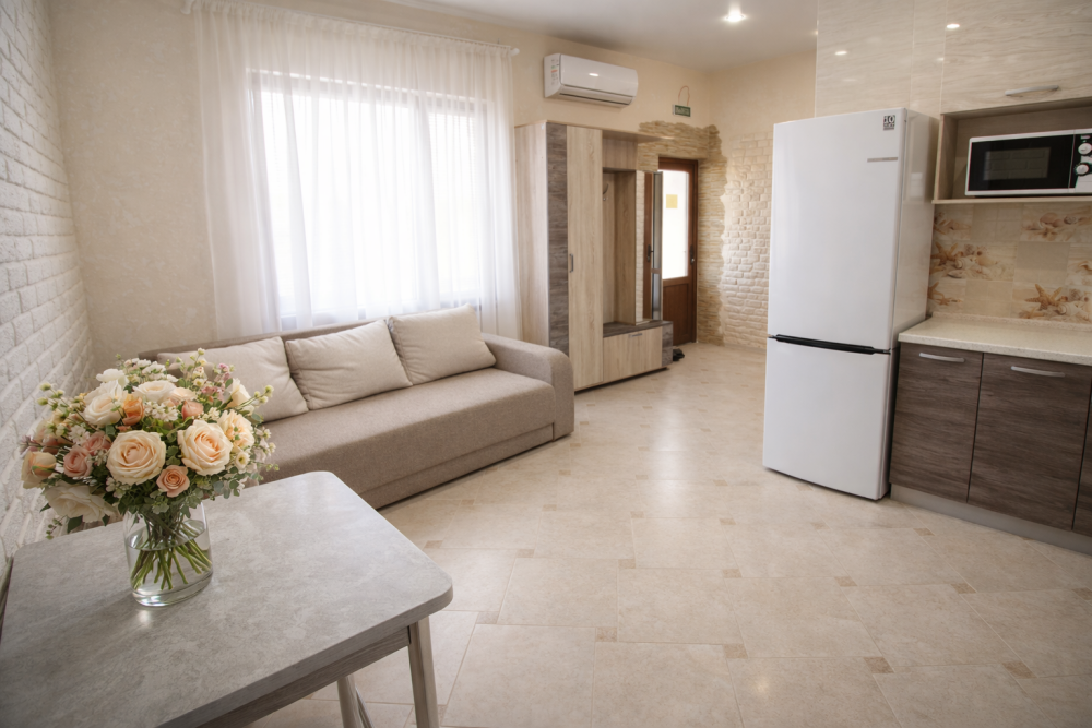 | Комментарий к цене | Уютный, светлый 5-ти местный, двухкомнатный номер-студия с кухней площадью 25 м2 расположен на втором этаже. В номере есть: • Современная сантехника и мебель • Кухня со всем необходимым • Холодильник • Микроволновая печь • Телевизор (Smart TV 4K HDR) • Двуспальный раскладной диван • Двуспальная кровать с ортопедическим матрасом • Односпальный диван-кровать • Кондиционер • Шкаф, тумбочки • Журнальный столик • Wi-Fi • Телевизор (кабельное телевидение) • Санузел • Стиральная машина • Набор постельного белья и полотенец для каждого гостя • Средства личной гигиены • Сушилка для белья |